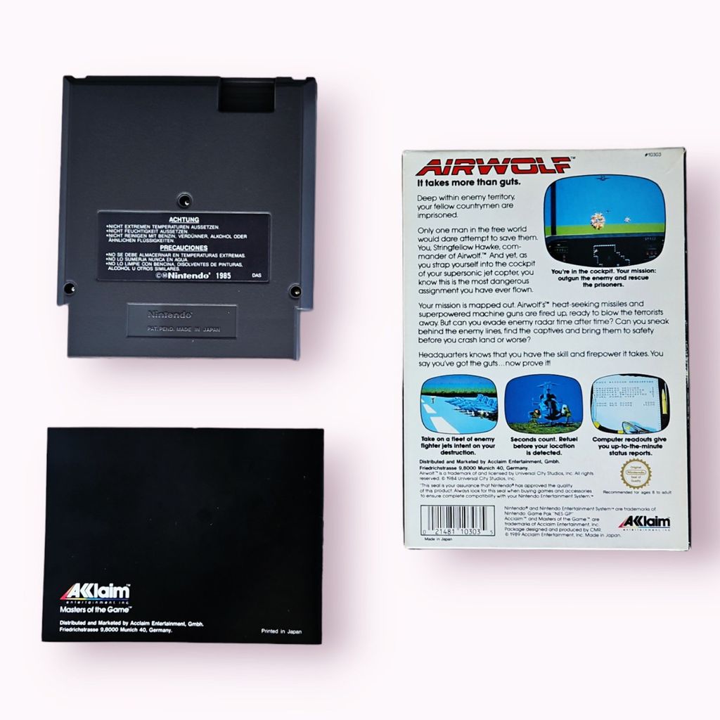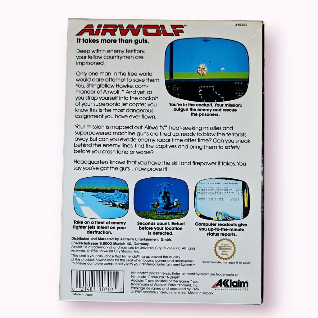 The NES version was not a port of the arcade game, but was instead developed by Beam Software and released by Acclaim in 1988. The game places the player in the cockpit of the Airwolf helicopter attempting to shoot down enemy aircraft and rescue prisoners.