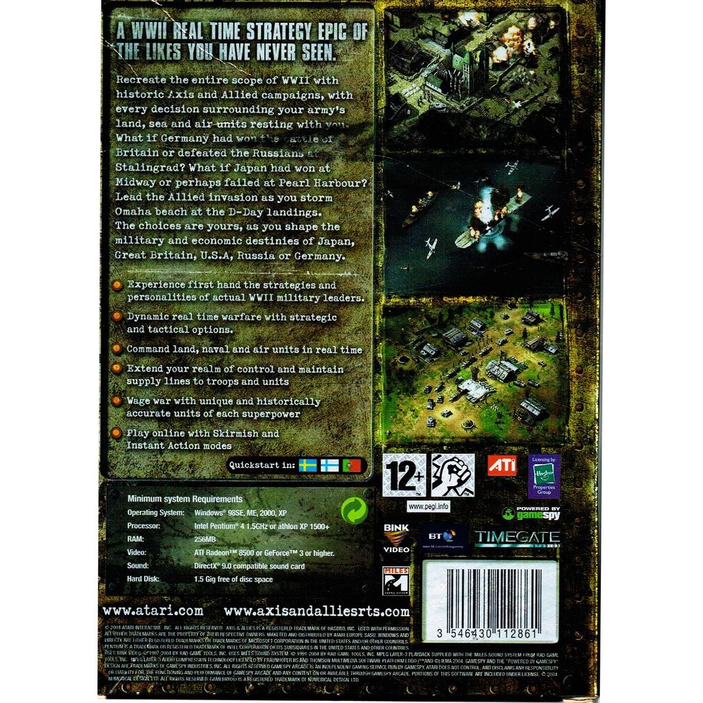 Axis & Allies is a real-time strategy World War II video game developed by TimeGate Studios and published by Atari, Inc. for the Windows XP and older platforms.The game was released on November 2, 2004. It is based on the board game series Axis & Allies from Milton Bradley and also on TimeGate's Kohan series. The game is set in the years after Japan and the United States entered into the war. The game allows the player to act as a commander of WWII to build military forces to fight against other generals, while maintaining a military economy. The game enables the player to rewrite and recreate the history of World War II, using military units and technologies from the war. Correspondingly, the tagline for the game is, "World War II is in your hands."