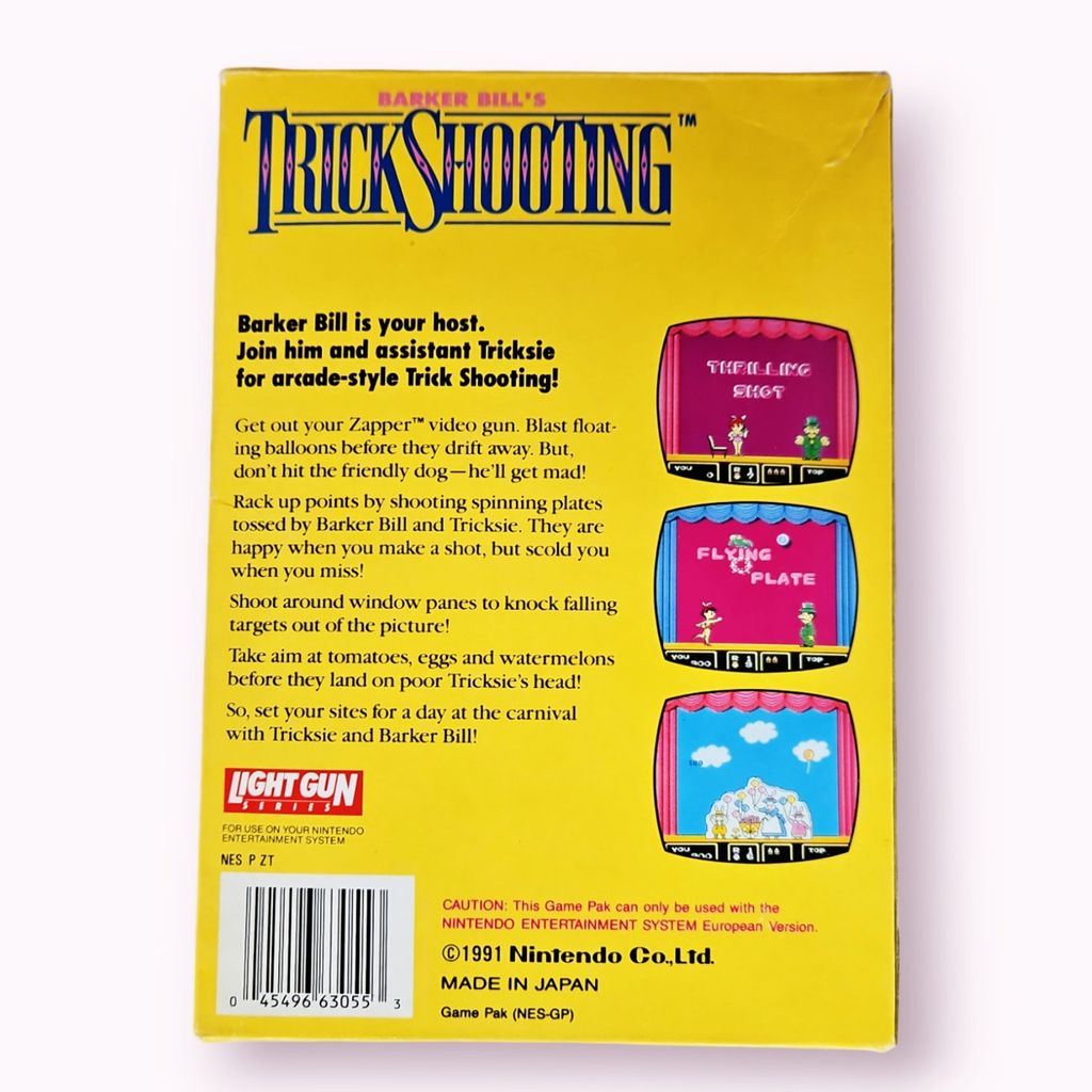 Barker Bill's Trick Shooting consists of four carnival-type game modes in which the player uses a NES Zapper to shoot various objects for points.Higher scores are given for more daring shots: those on the verge of disappearing or breaking award the most points.