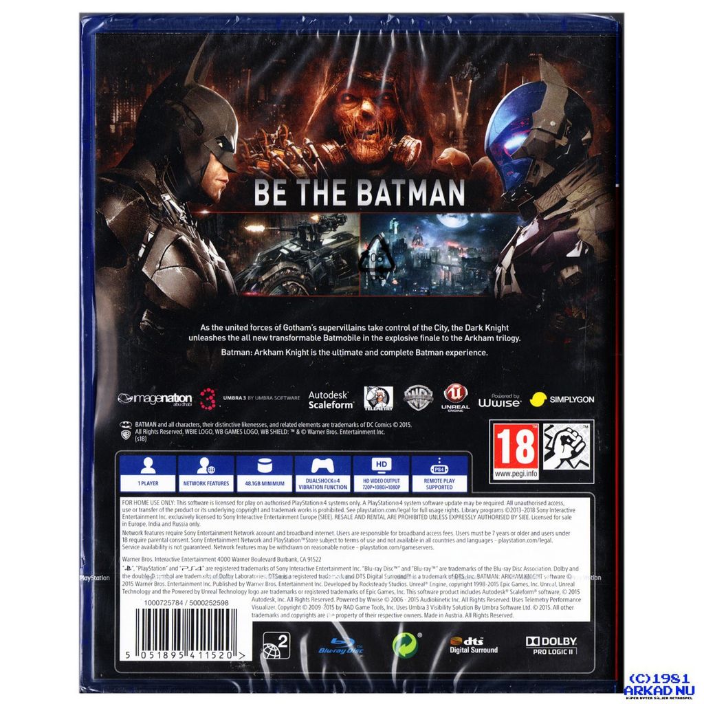 I den sista delen i Arkham-serien, möter Batman det slutgiltiga hotet mot staden som han har svurit att skydda. Scarecrow återvänder för att leda en samling superskurkar, inklusive Penguin, Two-Face och Harley Quinn, vars mål är att förgöra Batman. Batman: Arkham Knight visar upp Rocksteadys unikt utformad version av Batmobile, som är körbar för första gången i Arkham-serien. Införandet av denna legendariska bil, kombinerat med den fantastiska gameplay vi är vana vid i Batman Arkham-serien, erbjuder spelare den ultimata Batman-erfarenheten när de slåss genom Gothams gator och sväva över himlen.