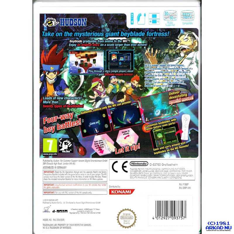 Beyblade: Metal Fusion - Battle Fortress is a Beyblade video game for the Wii. It features a Story Mode with an original storyline featuring characters from Beyblade: Metal Fusion. Players can collect hundreds of different Beyblade parts in order to customize their very own Beyblade. Outside of the "Story Mode" up to 4 players can play in a "Battle Mode" which pits the player against the computer or their friends in a Beyblade battle. Players can unleash special moves for their Beyblade by shaking the Wii Remote back and forth rapidly. Players can also customize the Beystadium by choosing the shape, terrain, and features that can vary the Beybattle. There is also a Survival Mode where your bey battles an endless supply of enemy blades and powerful "robot" tops that keep themselves locked to a circular track in the arena and can't be dislodged, only outlasted. Players can also import their in-game Beyblade into their Wii Remote so they may go to a friends house and battle there. Although there is no voice acting in the game, players can connect Beyblade: Metal Fusion for the DS to the Wii to unlock exclusive Beyblade parts. For a limited time Battle Fortress contains a DVD of an episode of Beyblade: Metal Fusion with the game. The Japanese version comes with an exclusive Counter Leone D125B. Once you have finished story mode one time you start to collect the Golden Parts of Dark Bull H145SD, Rock Leone 145WB, Flame Sagittario C145S, and Storm Pegasus 105RF, even their left spin parts! At the end of the game, instead of fighting a B-Killer you battle against a young man named Rochi who wields a Gold Devil Serpenter 125SF.