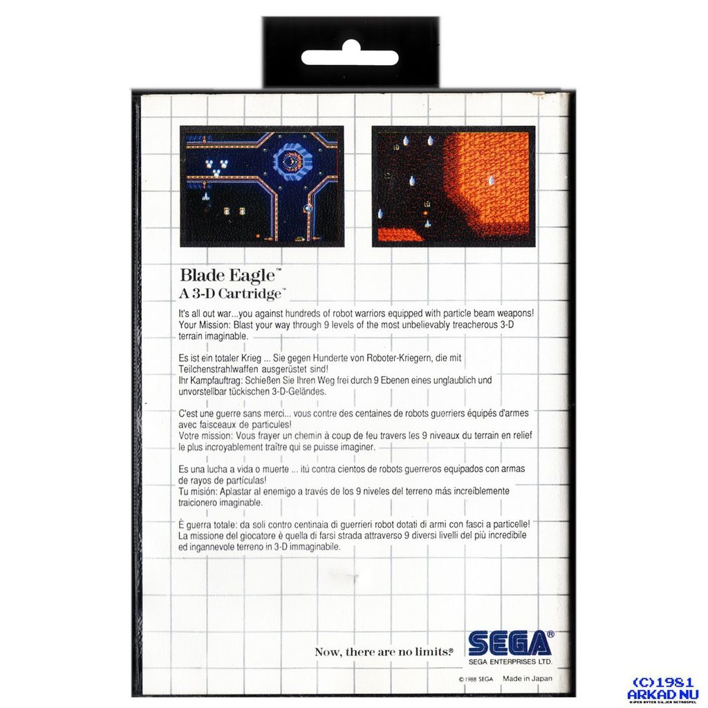 Blade Eagle 3-D is a vertical rail shooter video game, developed and published by Sega and was first released on March 26, 1988 in Japan for the Mark III as Gold Cartridge,December 31, 1988 in North America and later in Europe.