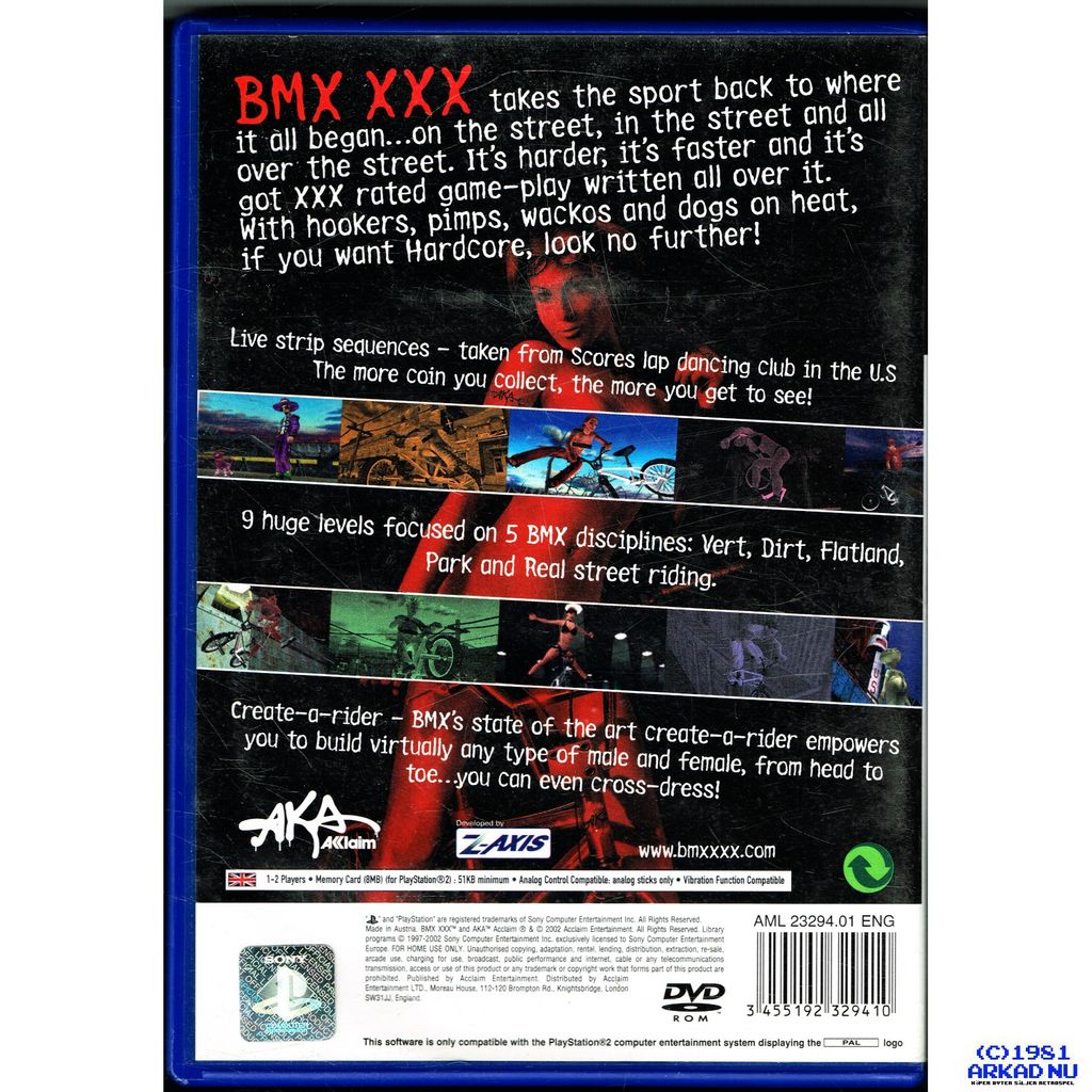 BMX XXX is a sports video game developed by Z-Axis and published by Acclaim Entertainment under their AKA Acclaim label for the Xbox, PlayStation 2 and GameCube. While primarily a BMX-based action sports title, it earned most of its notoriety for containing nudity, foul language and adult humor. The game allows the player to create female characters that are fully topless and view live-action video clips of real life strippers, also with bare breasts. Consequently, BMX XXX was initially denied classification in Australia. In North America, while the game is available uncensored on the GameCube and Xbox, all naked breasts are covered in the PlayStation 2 version. While the adult content garnered a great deal of publicity for the game, it was almost entirely negative, and it was eventually released to mediocre reviews and poor sales.
