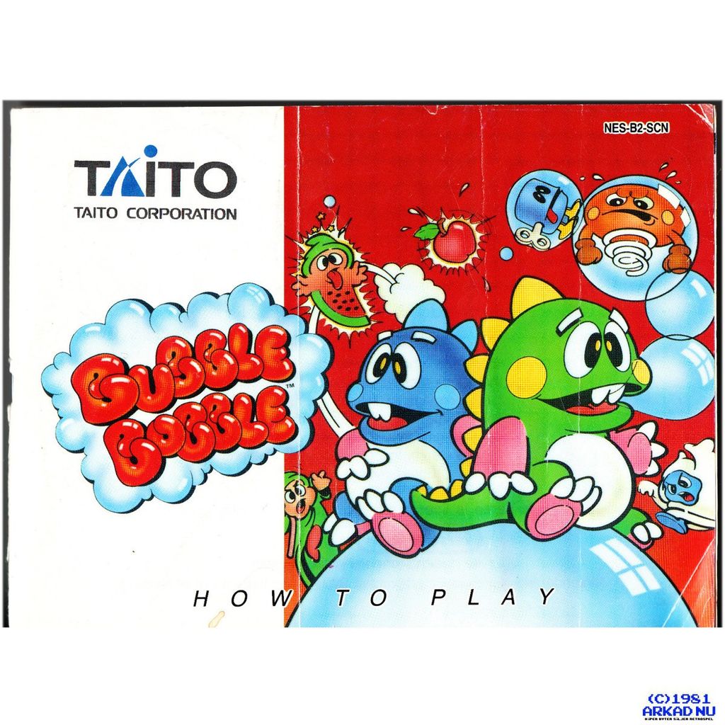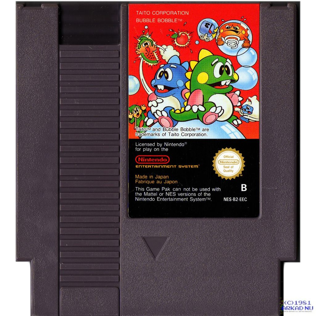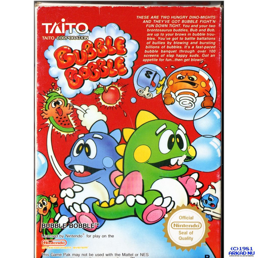 Bubble Bobble, ursprungligen ett arkadspel från Taito år 1986. Det finns även som konsolspel till bland annat NES och i versioner för de flesta hemdatorer från 1980-talet, till exempel Commodore 64, Atari ST och Amiga.