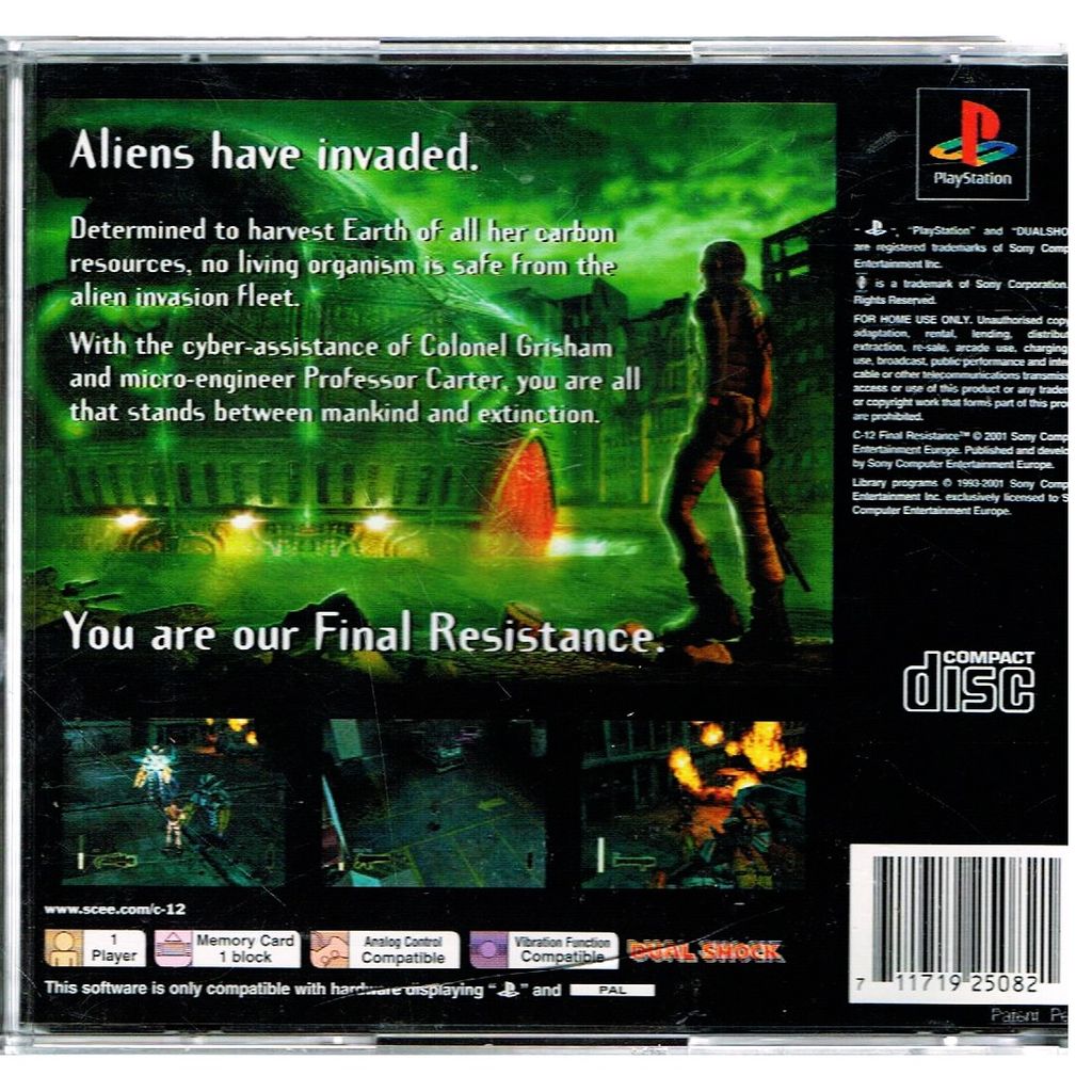 C-12: Final Resistance is a video game developed by SCE Studio Cambridge for the PlayStation. It was released in Europe on April 6, 2001 and in North America on July 22, 2002. It was released in a twin pack, bundled with MediEvil in 2003.