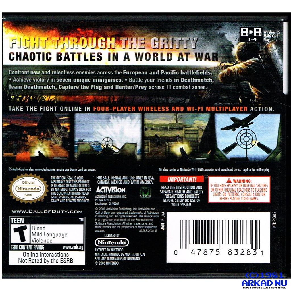 Call of Duty: World at War is a 2008 first person shooter video game in the Call of Duty franchise, developed for the Nintendo DS.The game takes place during World War II and features many elements of gameplay typical to the series, including the usage of iron sights, and vehicular missions. It was released by Activision alongside the console versions of the game on November 11, 2008 in North America