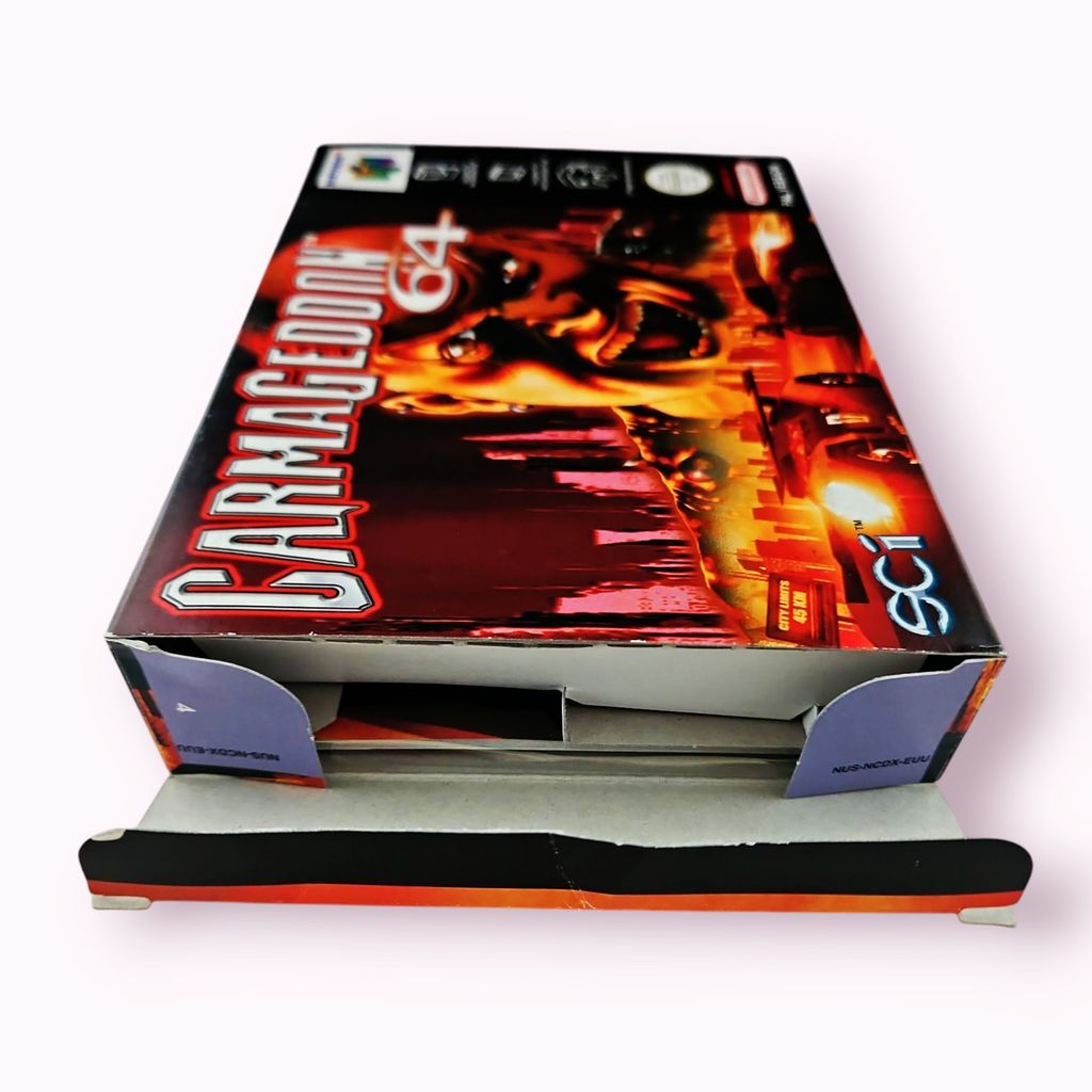 Släpp loss galenskapen i Carmageddon 64, där reglerna inte existerar och målet är total förödelse! Kör genom öppna banor, mosa zombies (eller fotgängare beroende på version) och uppgradera ditt fordon i detta brutala racingspel med en mörk twist.
