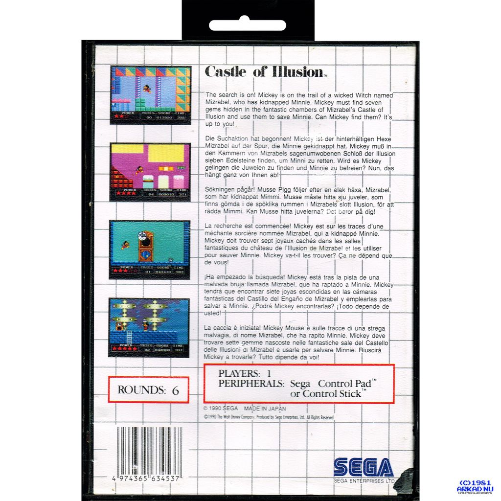 Castle of Illusion är ett plattformsspel där spelaren styr Musse Pigg, som ska rädda Mimmi Pigg från den onda häxan Mizrabel.