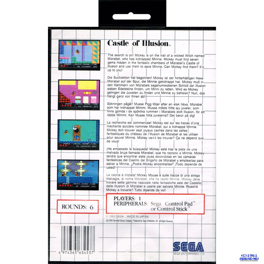Castle of Illusion är ett plattformsspel där spelaren styr Musse Pigg, som ska rädda Mimmi Pigg från den onda häxan Mizrabel.