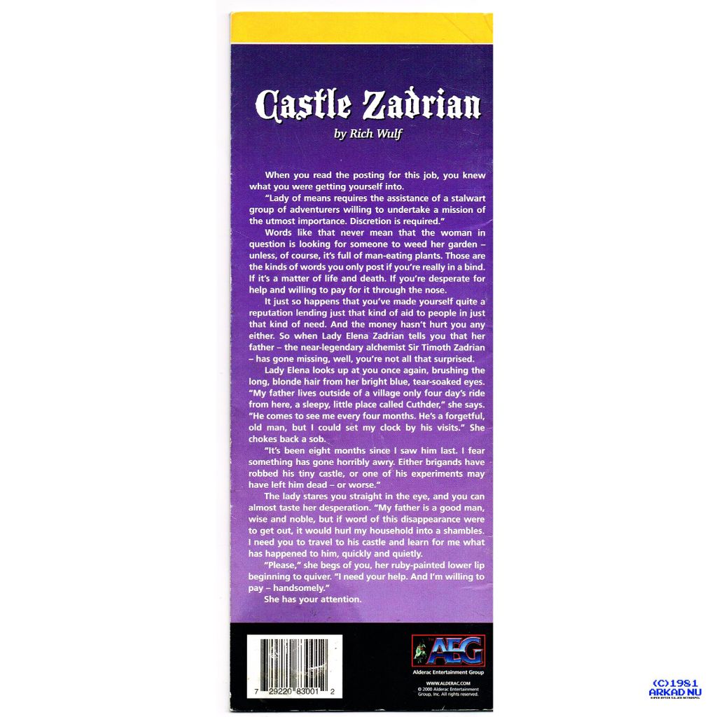 It just so happens that you've made yourself quite a reputation lending just that kind of aid to people in just that kind of need. And the money hasn't hurt you any either. So when Lady Elena Zadrian tells you that her father--the near-legendary alchemist Sir Timoth Zadrian--has gone missing, well, you're not all that surprised.