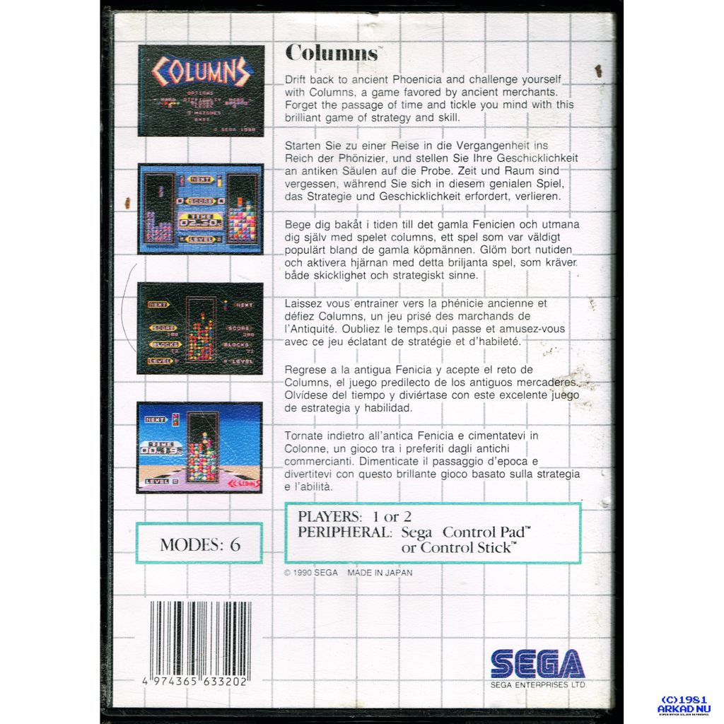 Columns is a puzzle game for the Sega Mega Drive,The Entertainer 3000 and Arcade, playable with one or two players.