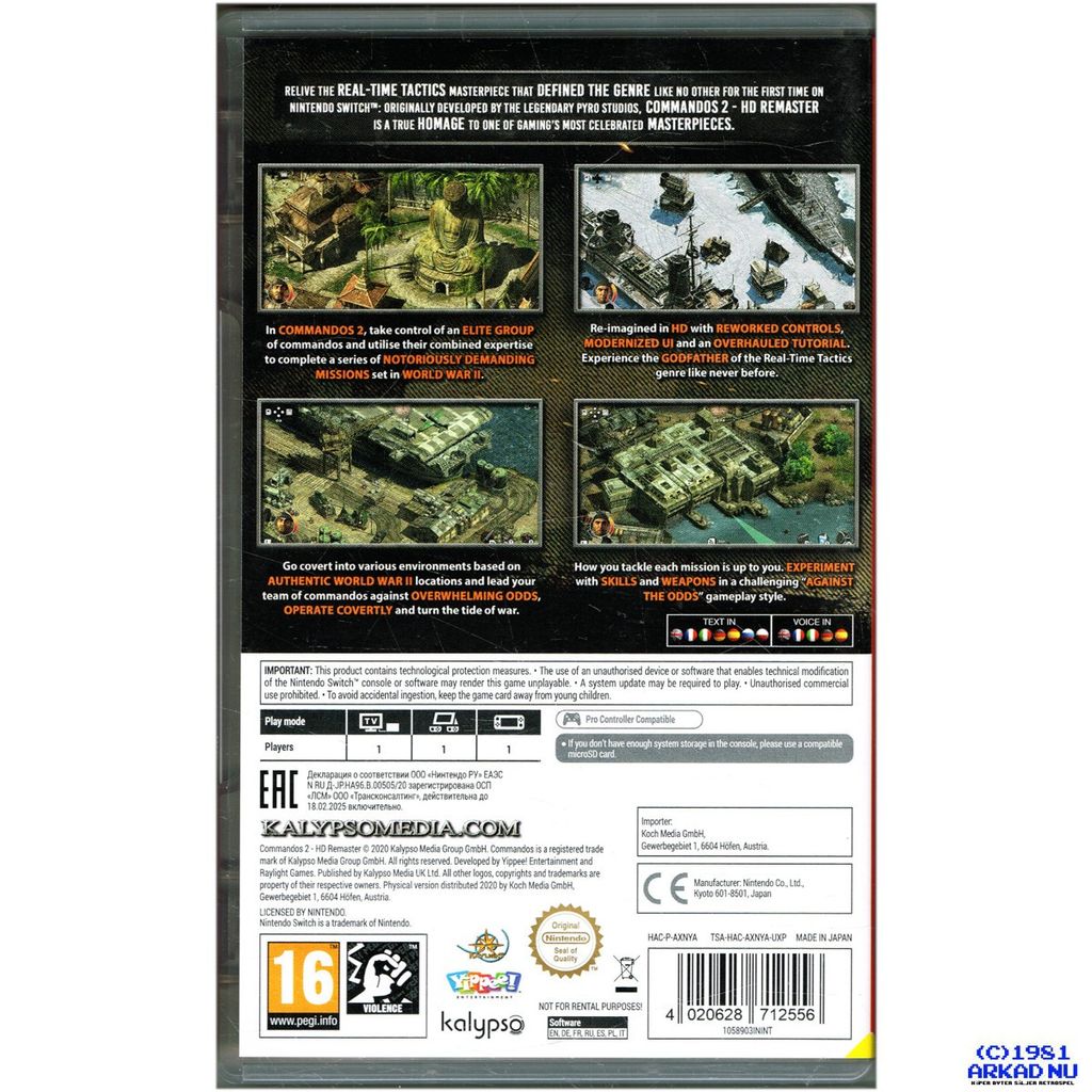 Relive the real-time tactics masterpiece that defined the genre like no other for the first time on Nintendo Switch™: Originally developed by the legendary Pyro Studios, Commandos 2 - HD Remaster is a true homage to one of gaming’s most celebrated masterpieces. Experience Commandos 2 Men of Courage like never before in high definition with reworked controls, UI and tutorial. Take control of an elite group of commandos who must venture deep into enemy territory and utilize their combined expertise to complete a series of notoriously demanding missions set in World War II. Go covert into various environments based on authentic World War II locations and lead your team of commandos against overwhelming odds, operate covertly and turn the tide of war.