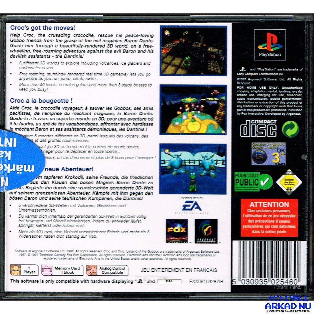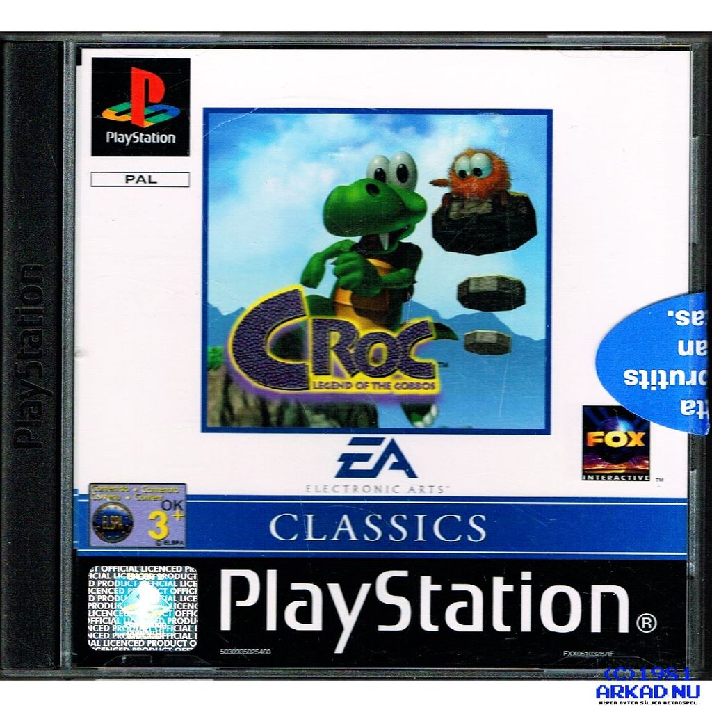 Croc: Legend of the Gobbos (also known as simply Croc, or in Japan as Croc! Pau-Pau Island is a platform video game published by Fox Interactive and developed by Argonaut Software for the PlayStation, Sega Saturn, Microsoft Windows and Game Boy Color. It follows protagonist Croc, and his attempts to rescue the furry creatures known as Gobbos from the antagonist, Baron Dante.