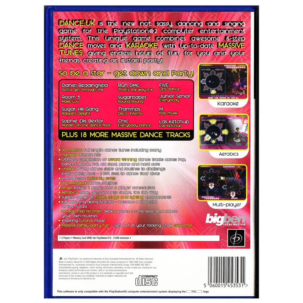 Dance:UK takes the standard 'bemani' formula - arrows appear rhythmically on screen and the player must hit the corresponding button (on either a dance mat peripheral or the standard controller) in time with these arrows and the music. Points are awarded for accuracy with extras for making certain 'combos' (mini-routines within a song which are deemed especially difficult or long).