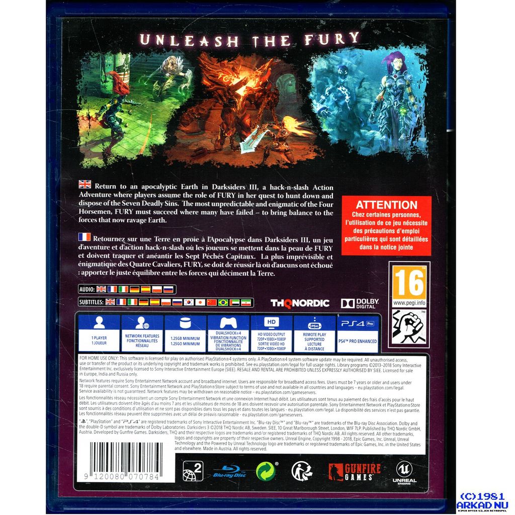 Återvänd till en apokalyptisk jord i Darksiders III, ett hack-n-slash action-äventyr där spelarna tar rollen som FURY i hennes strävan att jaga och förgöra de sju dödssynderna. Den mest oförutsägbara och gåtfulla av de fyra ryttarna, måste FURY lyckas där många andra har misslyckats, att balansera de krafter som nu ödelägger jorden. Darksiders III är det efterlängtade tredje kapitlet i den kritikerrosade Darksiders-franchisen.