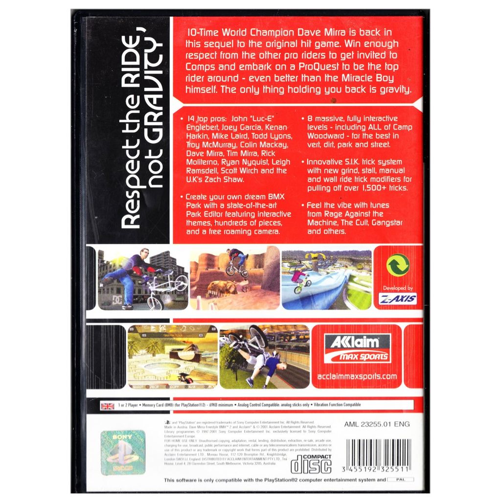 Dave Mirra Freestyle BMX 2 is the 2001 successor to Dave Mirra Freestyle BMX and was developed by Z-Axis and Full Fat and published by Acclaim Entertainment under their Acclaim Max Sports label. It was released for the PlayStation 2 in August 2001, and in the following months it was ported to the GameCube, Game Boy Advance, and Xbox video game systems. Both the GameCube and Xbox ports featured two extra levels that were not present in the PS2 version.