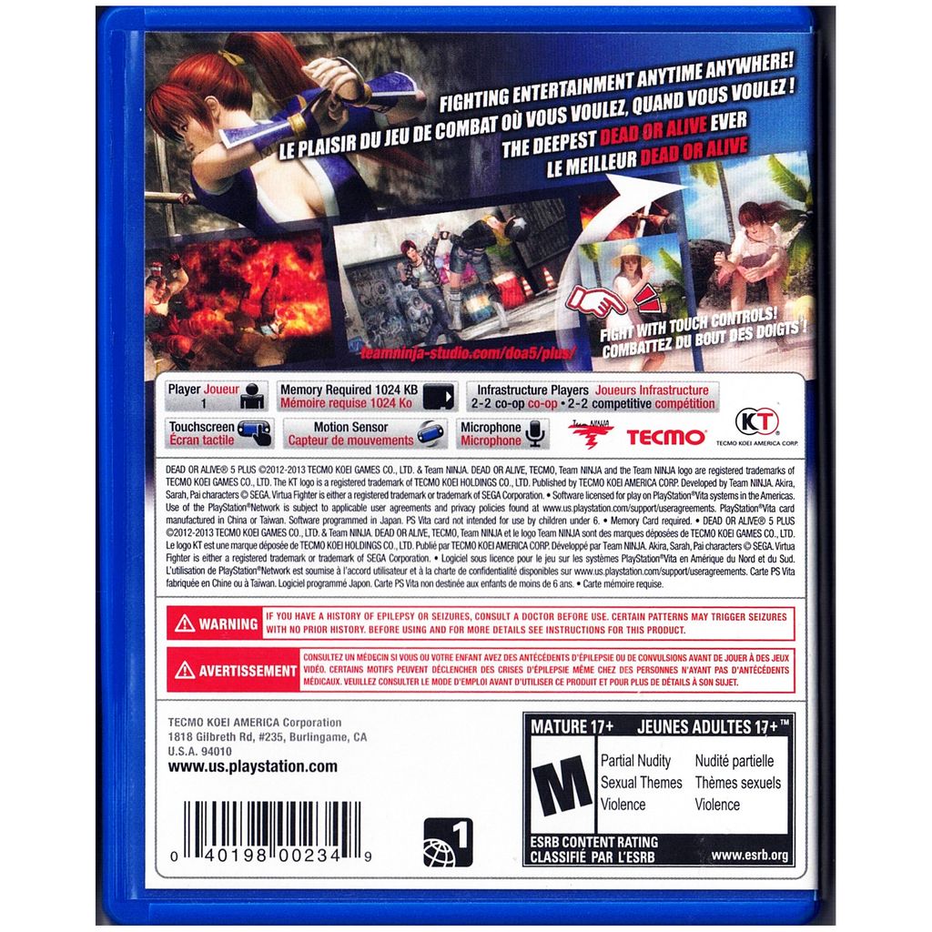 Dead Or Alive 5 Plus takes the signature fighting style of the popular DOA series, combined with the stunning graphics and new martial arts techniques of the recent console release, and brings it to the Vita with all-new system-specific features.In Dead Or Alive 5 Plus, players will take on the roles of the cast of DEAD OR ALIVE fighters in an intense, action-packed brawler, set in visually striking locations from around the world. The famed DOA hand-to-hand combat returns, supported by 3D stages that update the series' characteristic style with a fresh look and feel.Stages in Dead Or Alive 5 Plus are more than spectacular visual backdrops, instead playing to a fighter's strengths. As a fight progresses, the backdrop will change and interact with players.