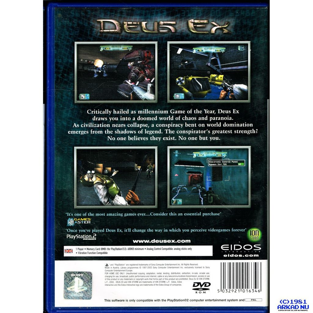 Deus Ex är ett actionrollspel utvecklat av Ion Storm, och publicerat av Eidos Interactive. Spelet släpptes till Windows och Mac OS år 2000 och två år senare även till Playstation 2.