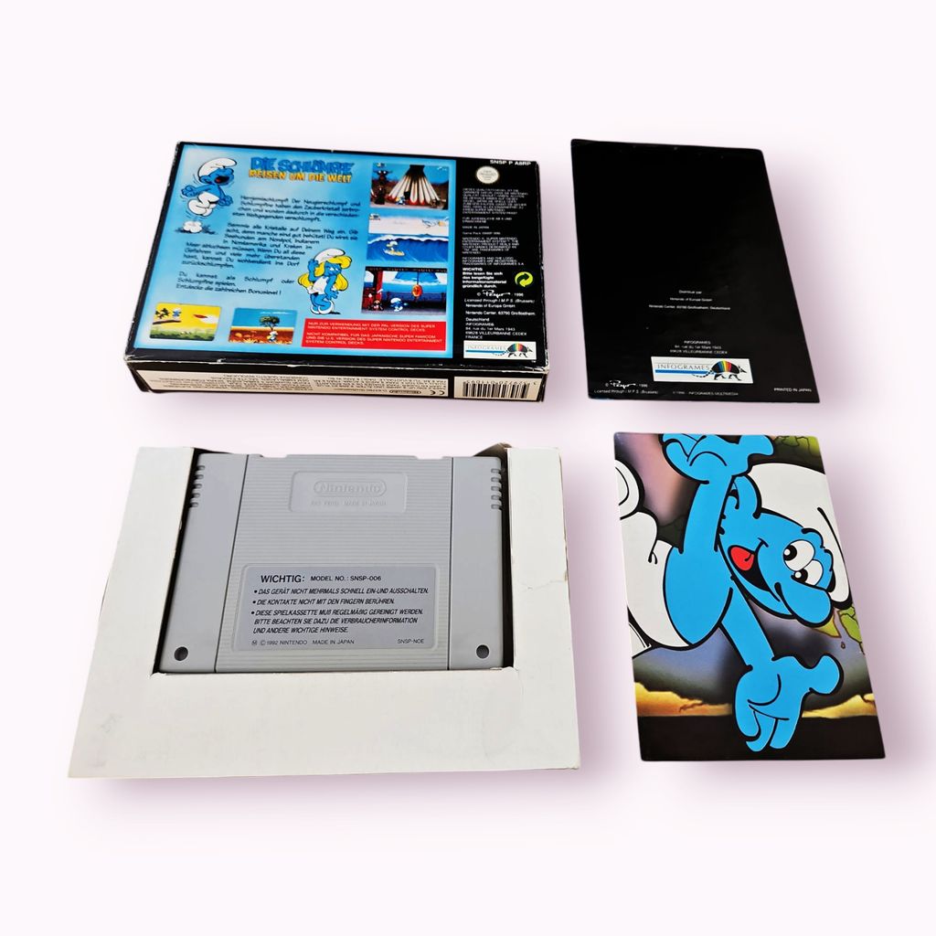 Die Schlümpfe: Reisen um die Welt (SNES) – Ett Smurf-tastiskt Plattformäventyr! Följ med Smurfarna på ett färgstarkt och actionfyllt äventyr runt jorden! Die Schlümpfe: Reisen um die Welt (The Smurfs Travel the World) låter dig hoppa, springa och lösa utmaningar i ikoniska miljöer medan du räddar Smurfkompisar och stoppar Gargamels onda planer. Med vacker grafik, rolig gameplay och klassisk charm är detta ett perfekt spel för plattformsälskare!