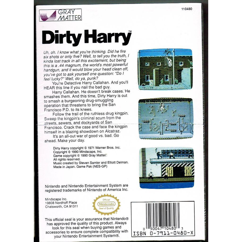 The game is a side-scroller in which players must guide Dirty Harry throughout San Francisco. He wears a blue suit, although it can be exchanged for a white suit. He wields his signature .44 magnum, and players have the ability to draw the weapon without actually firing it. Most notable, in reference to real-life handguns, the .44 also exhibits a recoil effect when fired. Other weapons consist of LAWs rockets, harpoon guns, and explosive remote-controlled cars. When injured, Harry's health can be restored by eating chili dogs.