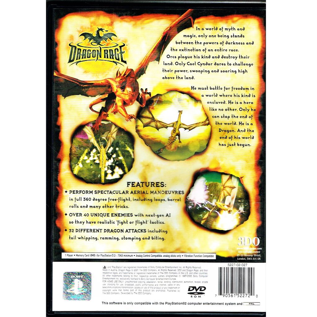 Dragon Rage is a PlayStation 2 game by The 3DO Company. The player controls an escaped dragon named Cael Cyndar in a mission to save the dragon race from extinction by the orcs. Cael's guide is Adara the Sprite. The dragon's attacks include ramming, biting, grabbing & dropping, and breathing fire. Whenever Cael eats orcs, he gains Mana points. Eating farm animals replenishes Health. When Cael releases captured sprites, they give information or teach Cael about his magical powers. Orc forces include ground units (orc warriors), naval units (ships), air units (hot air balloons), castle defenses (towers), and war machines (catapults). There are many animations and cut scenes. The game was originally intended to be a Might and Magic title.The title originally going to be Dragon Wars of Might and Magic. However, as the story did not truly coincide with the Might and Magic universe the title was dropped