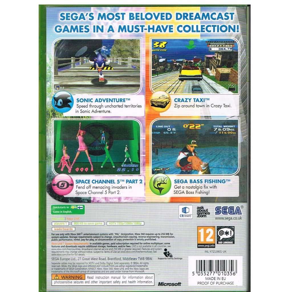Dreamcast Collection is a video game compilation for Xbox 360 and PC. It includes four games from the Sega Dreamcast, these games include Sega Bass Fishing, Sonic Adventure, Space Channel 5: Part 2 and Crazy Taxi.