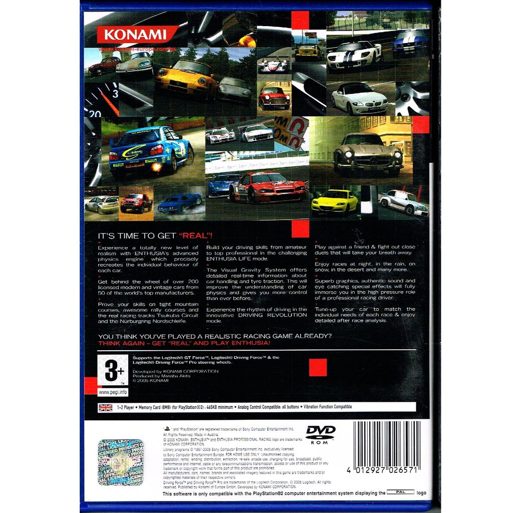 Enthusia Professional Racing (Ensūjia Purofesshonaru Rēshingu) is a racing game for the PlayStation 2. It is the first sim racing game made by Konami.