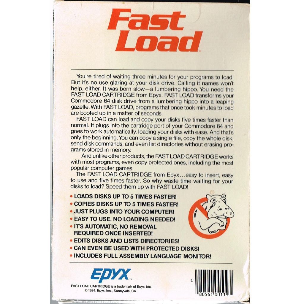 Epyx Fast Load tillåter program att ladda från Commodore 1541 diskettstation ungefär fem gånger snabbare än den normala hastigheten. Eftersom det lagras på en cartridge och därmed ger omedelbar tillgång utan att kräva hårdvaru modifiering av C64 eller hårddisk, Fast Load blev snabbt en mycket populärt tillbehör bland C64-användare.