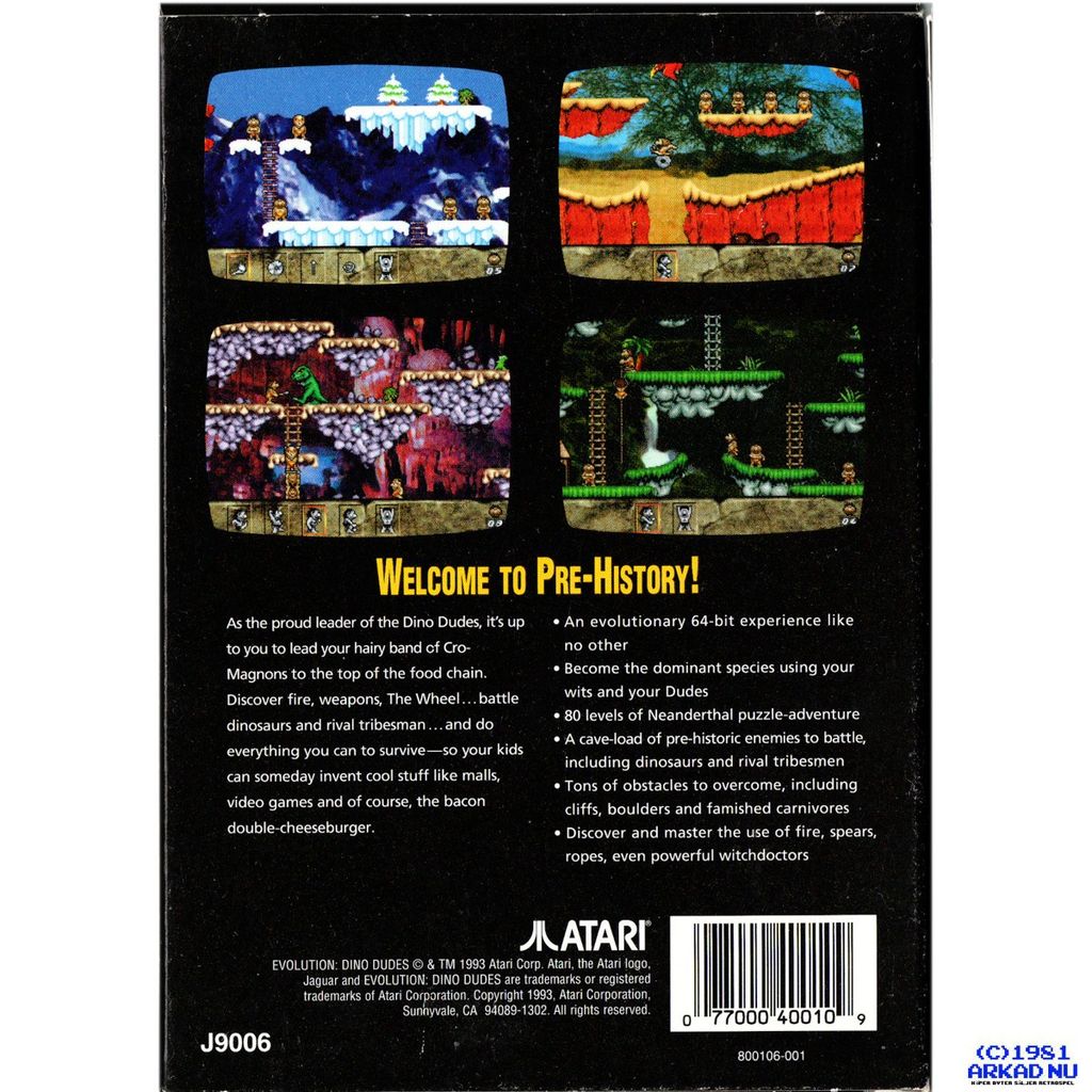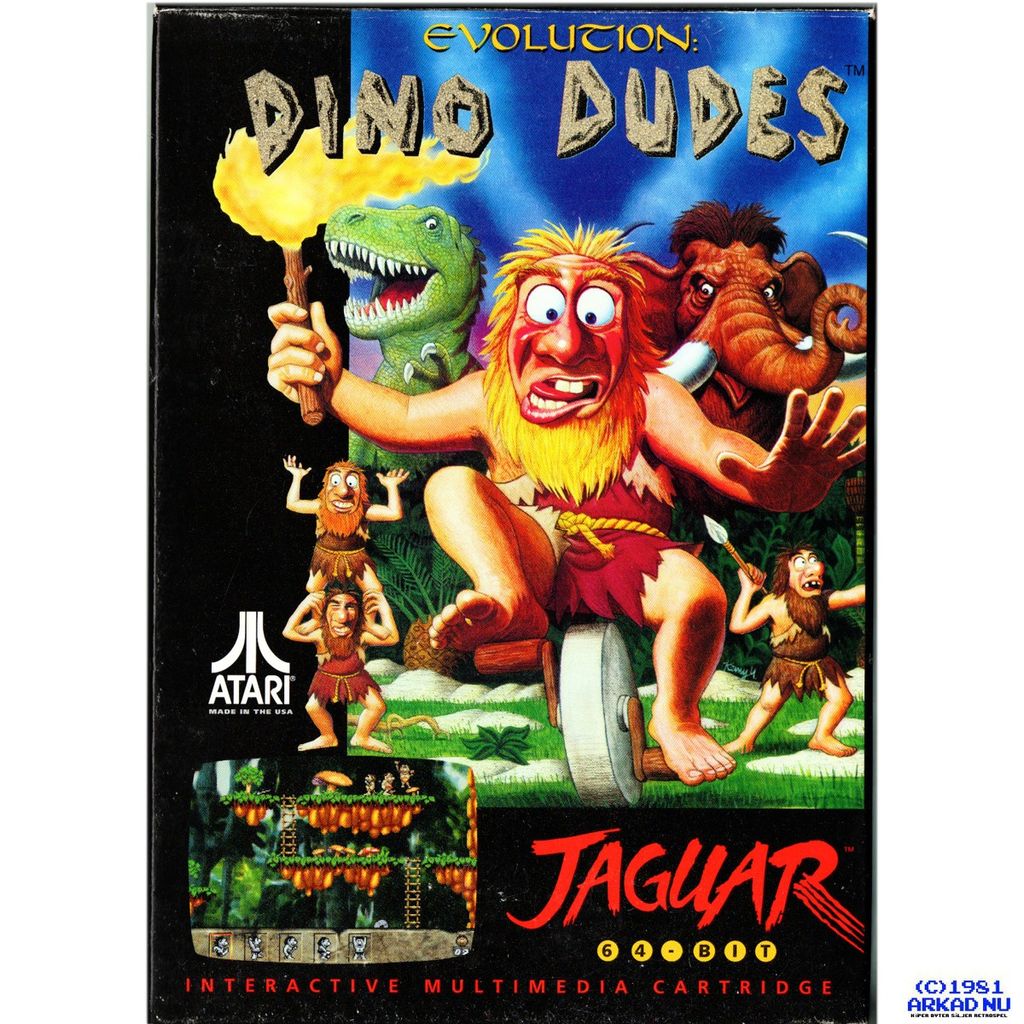Guide your tribe of hairy humans through the anachronistic dangers of pre-history in Evolution: Dino Dudes, Jaguar cartridge part number J9006.