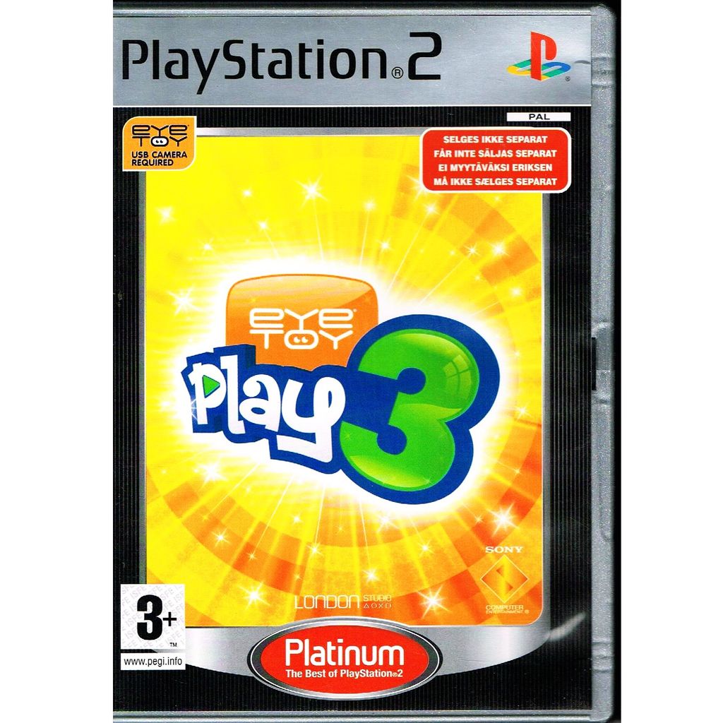 EyeToy: Play 3 is the third game in the EyeToy: Play series, for up to four players. The camera takes snapshots during the game for your player and is a requirement to play the game. Unlike previous EyeToy: Play games, Play 3 was not released in North America. Unlike the previous games, 4 players were able to play on screen at the same time as opposed to taking it in turns like the previous games.