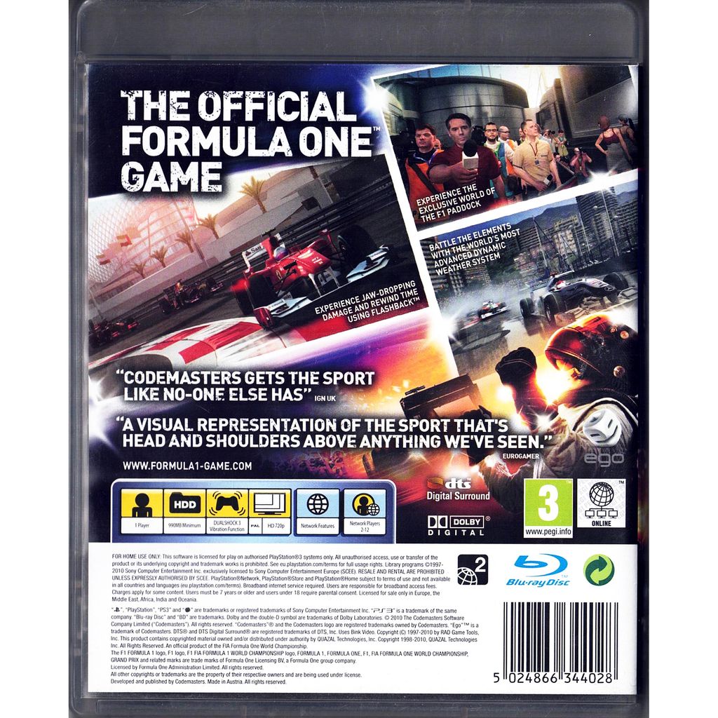 F1 2010 is a video game based on the 2010 season of the Formula One world championship.The game was released in September 2010 on the Microsoft Windows, PlayStation 3 and Xbox 360 platforms. It has sold 2.3 million units worldwide. The game engine is based on the new EGO 1.5 engine, an unofficially titled evolution of the EGO 1.0 engine that was created specially for the title.