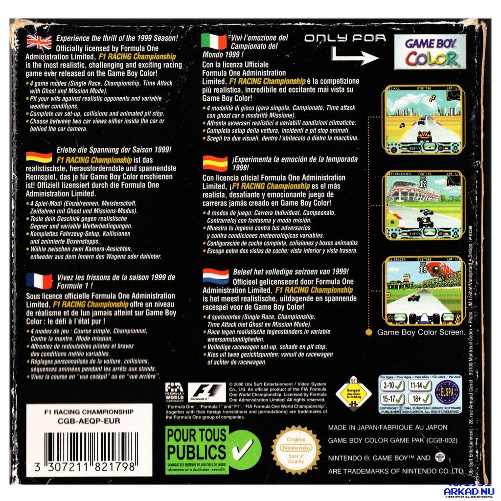 F1 RACING CHAMPIONSHIP GAMEBOY COLOR SVENSK SÅLT - NYTT BATTERI