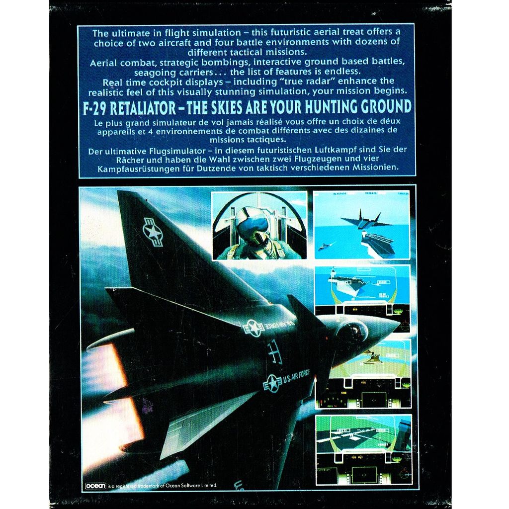 F29 Retaliator is a combat flight simulator video game developed by Digital Image Design and published by Ocean Software in 1989 Amiga and Atari ST, 1991 for the PC, and for the FM Towns and NEC PC-9801 in 1992-1993. Its working title was just Retaliator. The game was developed during the end of the Cold War, based mostly on speculations on then-future aircraft that were expected to be in use by the year 2002, in particular based on the design of the Lockheed Martin F-22 and the Grumman X-29A.