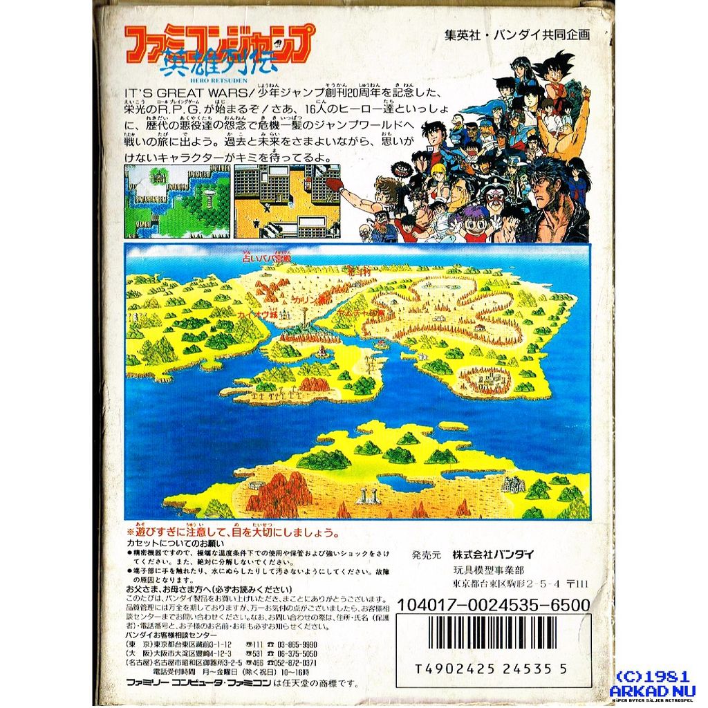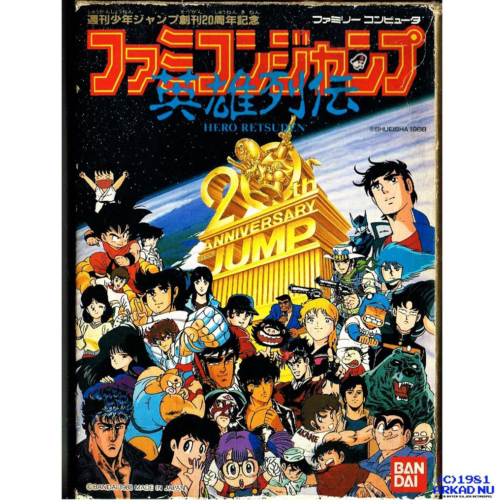 Famicom Jump: Hero Retsuden (Famikon Janpu Hīrō Retsuden, the subtitle translates to "Heroes History") is a 1988 role-playing video game for the Family Computer (Famicom/NES) published by Bandai. The game commemorates the 20th anniversary of Shueisha's manga anthology Weekly Shōnen Jump.