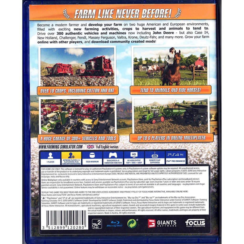 With over 300 vehicles and tools to use from all the leading brands,including John Deere, Case IH, New Holland, Challenger, Fendt, Massey Ferguson, Valtra, Krone, Deutz-Fahr, and many more, it’s up to you how to specialise as you develop and expand your farm from one of three unique starting situations. Begin with no property but plenty of money to build the farm of your dreams, or go for a more hardcore playstyle of a small starting farm with limited resources - the choice is yours, along with which crops to grow, which animals to tend to, and which missions to attempt.