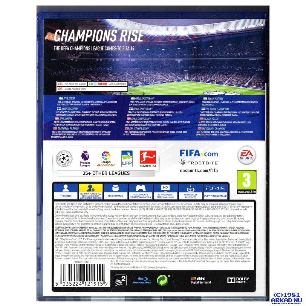 EA SPORTS™ FIFA 19 drivs av Frostbite™* och levererar en mästarvärdig upplevelse både på och utanför planen. FIFA 19, med UEFA Champions League i centrum, erbjuder förbättrade spelfunktioner som låter dig kontrollera varje ögonblick på planen. Dessutom levererar det nya och enastående spelsätt, bland annat den dramatiska avslutningen i berättelsen om Alex Hunter i Resan: Mästare*, ett nytt spelläge i det otroligt populära FIFA Ultimate Team™ och mer därtill. Mästare föds i FIFA 19.