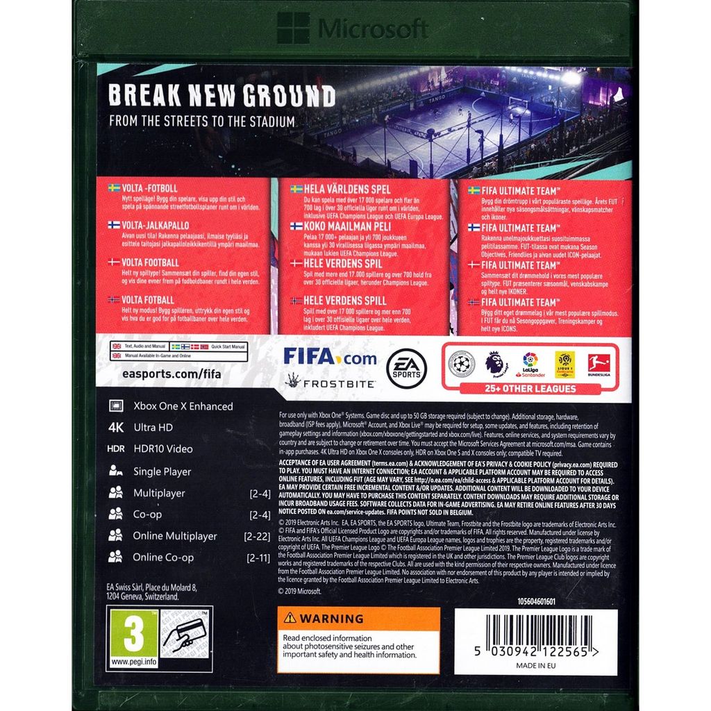 FIFA 20 väcker två sidor av världens största sport till liv - den professionella nivån och ett helt nytt, autentiskt gatufotbollsläge i EA SPORTS VOLTA. FIFA 20 är en utveckling på alla punkter: FOOTBALL INTELLIGENCE ger dig en oöverträffad plattform för realistisk gameplay, FIFA Ultimate Team erbjuder fler sätt att bygga din drömtrupp och EA SPORTS VOLTA tar sporten tillbaka till dess rötter på gatan.