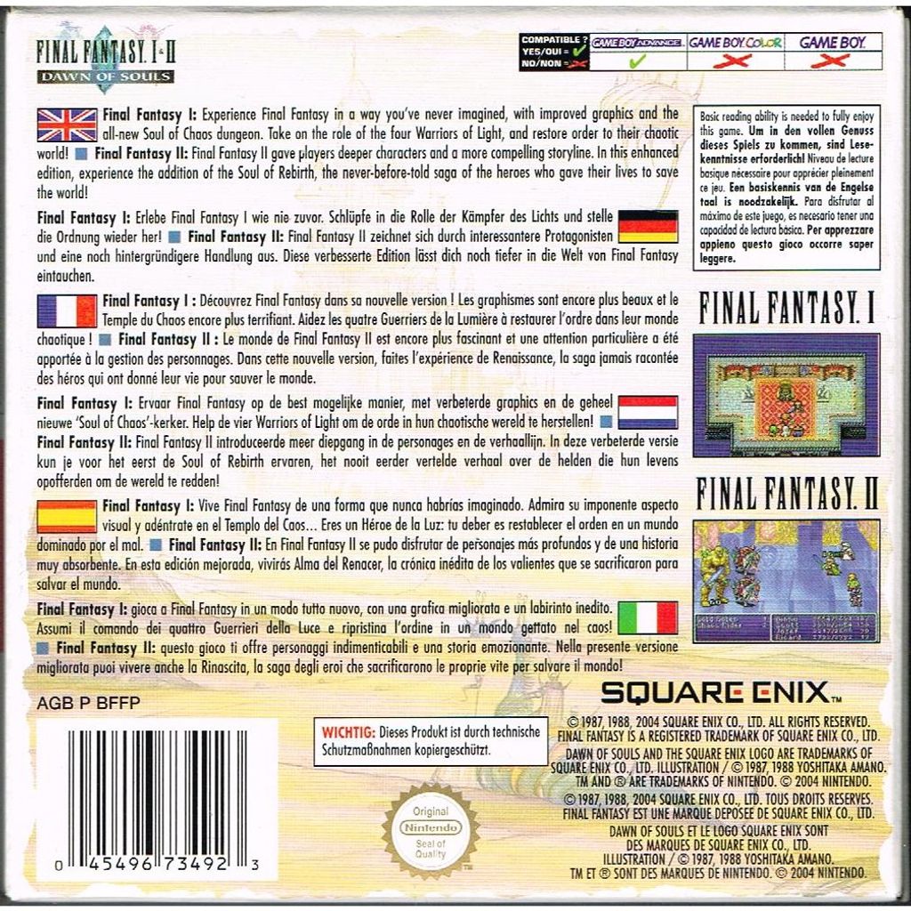 Final Fantasy I & II: Dawn of Souls is a compilation of the first two games in the Final Fantasy series. It was released in Japan under the title Final Fantasy I • II Advance. Graphically, it is similar to the previously released enhanced remakes of both games for the WonderSwan Color.