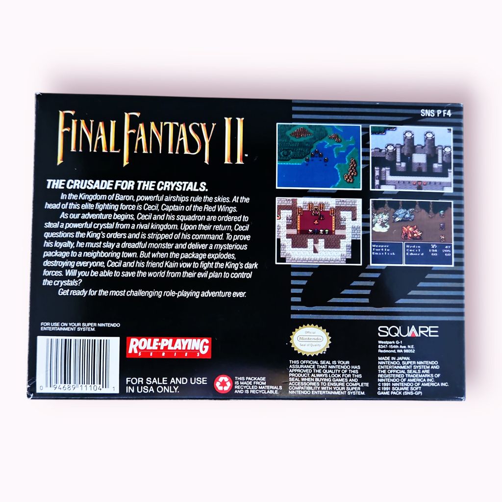 Final Fantasy II (SNES) – Ett Episk RPG-Äventyr! Upplev ett av de mest inflytelserika rollspelen någonsin! Final Fantasy II (egentligen Final Fantasy IV i Japan) tar dig med på en gripande resa fylld med hjältar, förräderi och en episk berättelse. Med ett djupt stridssystem, oförglömlig musik och strategiska turbaserade strider är detta ett måste för alla RPG-fans.