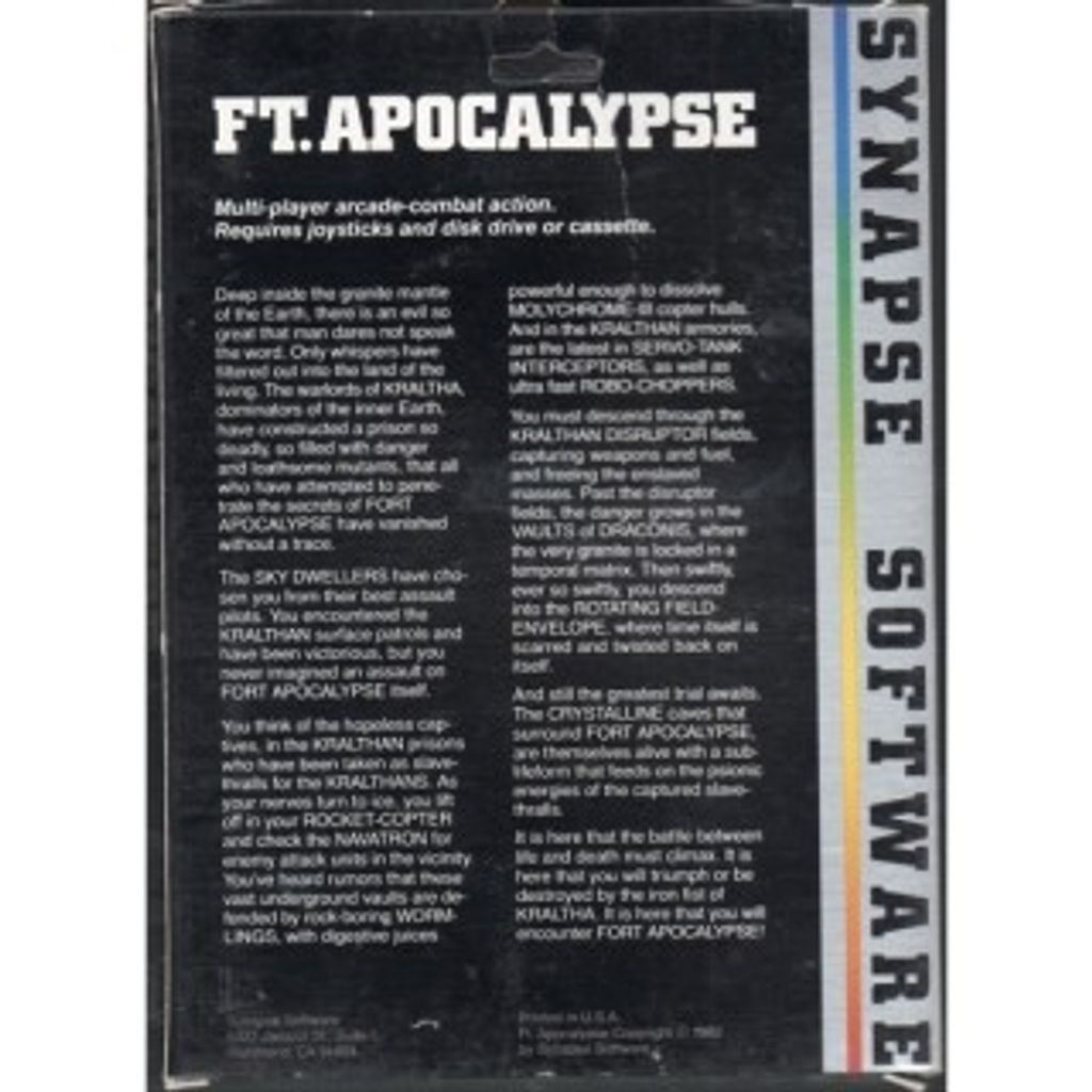 Fort Apocalypse is a 2D multi-directional scroller where the player navigates an underground prison in a helicopter, destroying or avoiding enemies while rescuing the prisoners. A contemporary of Choplifter, it has similarities to that game as well as the arcade games Scramble and Super Cobra.