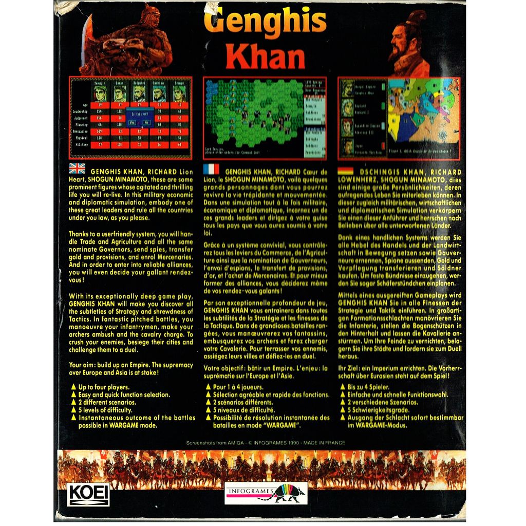 Genghis Khan, original full title Aoki Ōkami to Shiroki Mejika: Genghis Khan, is a 1987 turn-based strategy game developed by Koei, originally released for the NEC PC-9801,MSX and Sharp X68000 in 1988,the DOS and NES in 1990, and the Amiga in 1990.It is actually the second game in the series, after a 1985 Aoki Ōkami to Shiroki Mejika, also for PC-88, PC-98, and MSX.