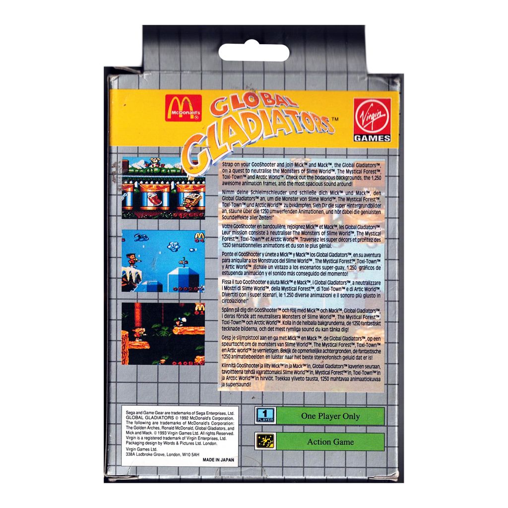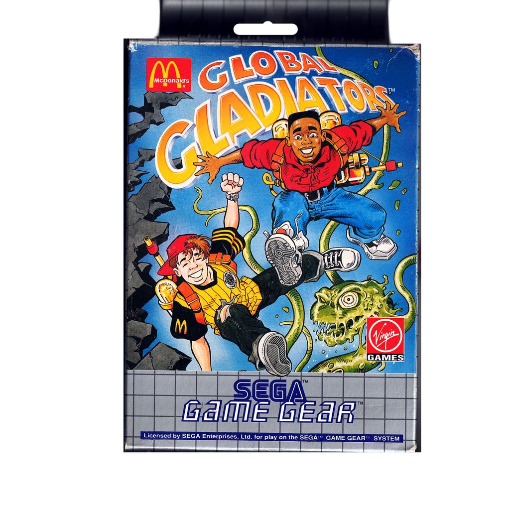 Global Gladiators is a platform game licensed from fast food chain McDonalds. While playing through the game's 12 levels you'll notice McDonalds logos, burgers and all sorts of family restaurant type stuff as you take Mick and Mack (the game's protagonists) on a journey to clean up "Monsters of Slime World", "Toxi-Town" and more.