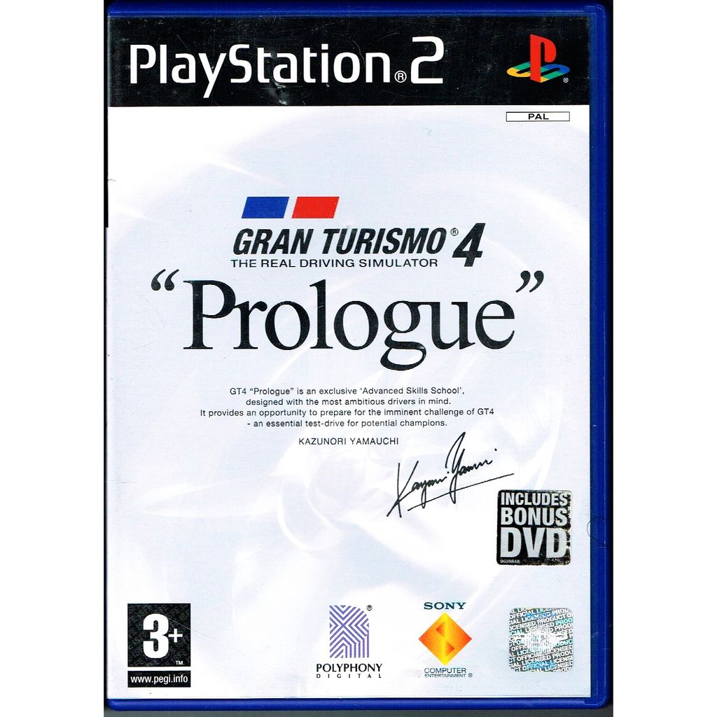 Gran Turismo 4 Prologue (Guran Tsūrisumo Fō Purorōgu) is a racing video game of the Gran Turismo series for Sony PlayStation 2 which is published by Polyphony Digital. It was released on December 4, 2003 in Japan and Southeast Asia and May 26, 2004 in Europe.For undisclosed reasons, the game was not released in the North American market. This short version title preceded the release of the full-length version Gran Turismo 4 in 2004 and was followed by Gran Turismo 5 Prologue in 2007.