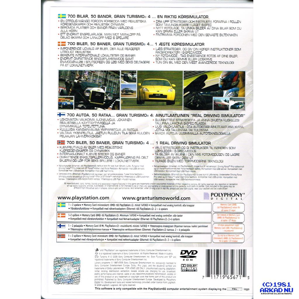 Gran Turismo 4 4 Guran Tsūrisumo Fō, förkortat GT4) är det fjärde racingspel i spelserien Gran turismo och släpptes sent 2004 i japan men släpptes våren 2005 i Europa och USA. Utgivet av Sony Computer Entertainment, Incorporated men utvecklat av Japanska Polyphony Digital. Spelet är utvecklat och släppt till Playstation 2 och är sista spelet i serien att stödjas för Playstation 2. Grand Turismo fyras Spelmotor är va en stor hitt och återanvänt i andra spel av Polyphony Digital, som Tourist Trophy. Playstation 2 hade bara 4 spel som stödjer 1080i och Polyphony Digital står bakom två av de, Gran Turismo 4 och Tourist Trophy. Spelet var en stor hit och va det bäst säljande spelet 2005, och 2006 släpptes en online-fuktion i Japan.