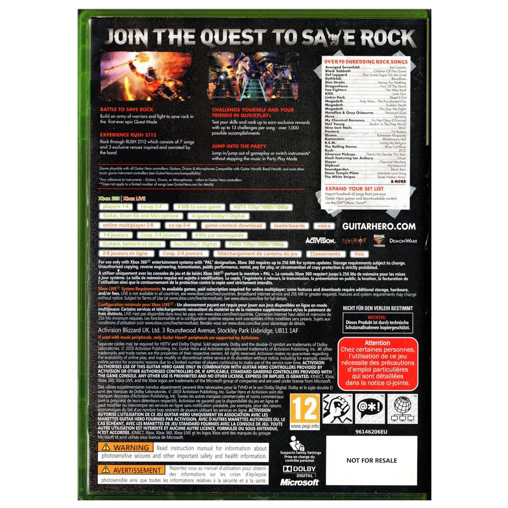 I Guitar Hero: Warriors of Rock ska du och dina kompisar ge er ut på en storslagen rockresa för att rädda rockmusiken. Spelet innehåller en imponerande låtlista med över 90 spår, en tuff gitarrkontroll i helt ny design och en mängd nya spelfunktioner, så nu kan vardagsrummets stjärnor slå an strängarna, trumma och sjunga sig hesa i det mest verklighetstrogna musikspelet någonsin. Med en ultimat rockmusiksamling där fokus ligger på hits med avancerad gitarrteknik från band som Black Sabbath, Slipknot och Megadeth samt enastående klassiker från Queen, Muse och KISS kan spelarna släppa lös sina inre rockstjärnor med fler belöningar och upplåsbart innehåll än någonsin tidigare. Detta tack vare Quest Mode, spelseriens första handlingsbaserade spelläge, och Quickplay+, utmaningsläget där Guitar Hero-fantaster kan testa sina rockfärdigheter. Guitar Hero: Warriors of Rock har den bästa motorn av alla musikspel och innehåller favoriter från de prisbelönta spelfunktioner som har gjort Guitar Hero till en av de populäraste spelserierna någonsin - till exempel Party Play, utmaningslägen och valfri kombination av upp till fyra instrument. Spelet är en komplett interaktiv upplevelse där vänner och fiender sluter sig samman på scenen i den ultimata rockmusikupplevelsen.