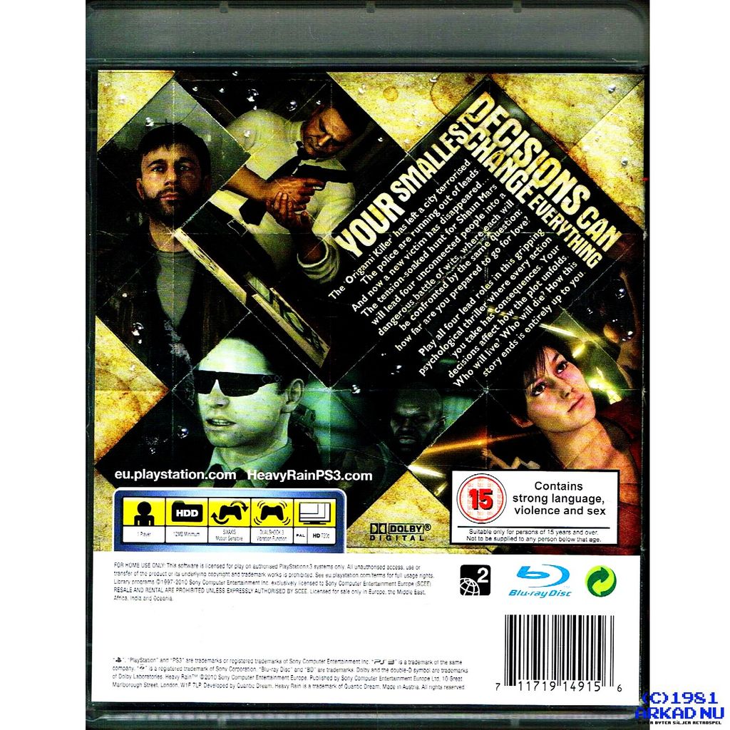 Heavy Rain är en dramatisk och psykologisk thriller där fyra personer deltar i mysteriet om den fruktade Origamimördaren, en seriemördare som använder regnvatten för att dränka sina offer. Spelet äger rum under oktober 2011. I en stad på USA:s östkust har 8 unga pojkar försvunnit. De hittas flera dagar senare döda och dränkta i regnvatten med en origamifigur i handen och en orkidé på bröstet. Allmänheten är lamslagen av skräck och myndigheterna verkar inte vara i närheten av att hitta den misstänkte gärningsmannen.
