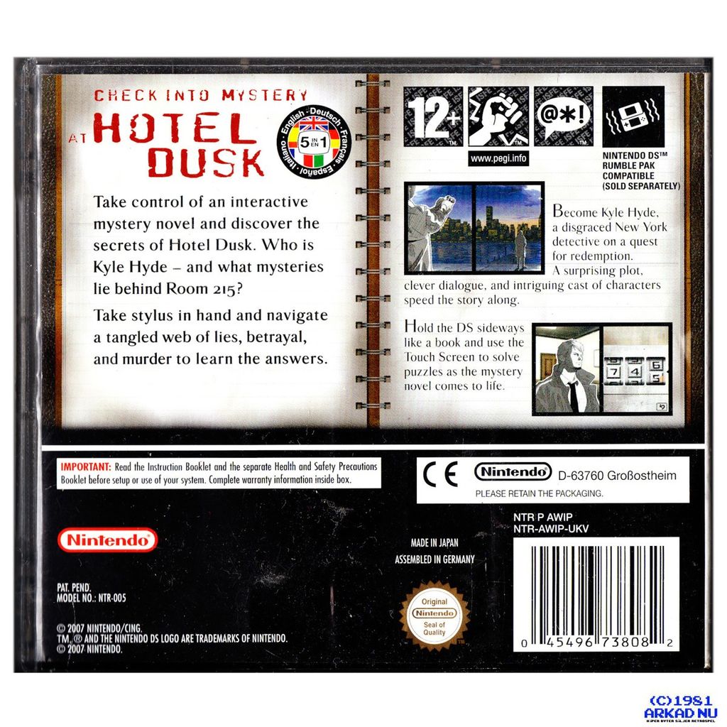 Kyle Hyde, a former New York cop, gets by with a salesman's job. He's sent to Hotel Dusk, a hotel in the middle of nowhere, to search for some particular items. But, as he spends the night there, the secrets and past of the hotel's guests reveal themselves. What is so special about Room 215? What do these people have to hide? It's up to you to take control and find out.