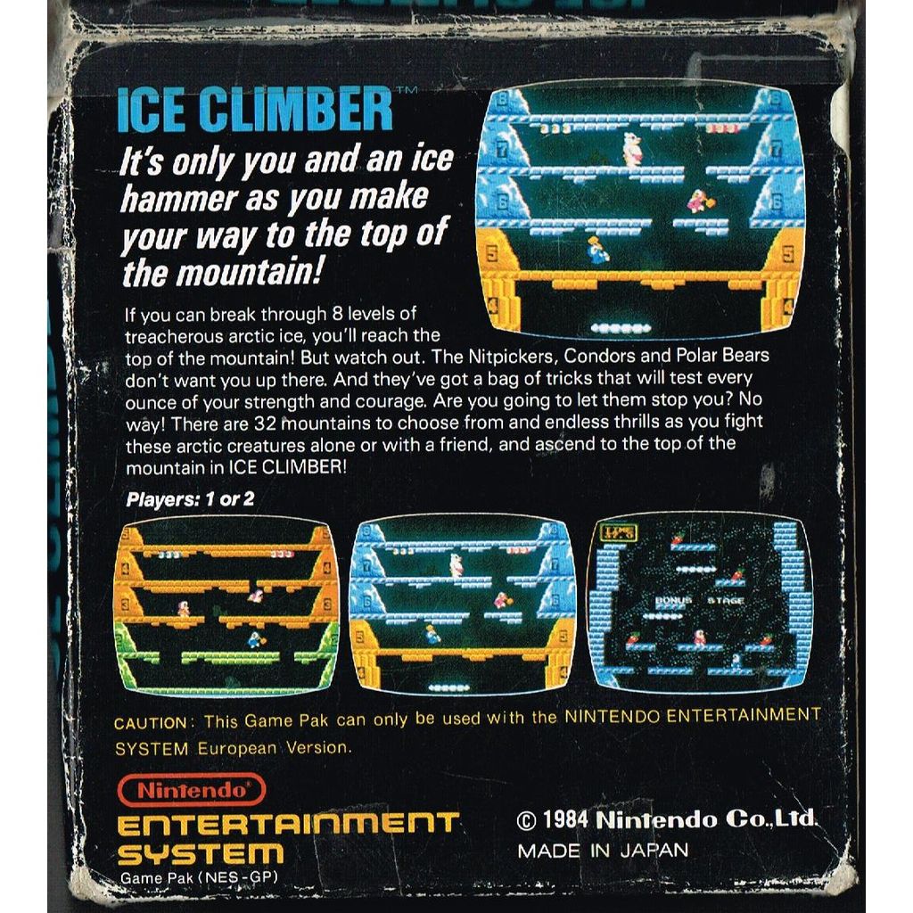 Ice Climber, klassiskt TV-spel av Nintendo som 1984 släpptes som arkadspel och 1985 till konsolen NES. Figurerna Popo och Nana klättrar uppför isberg medan de försöker undvika istroll och hackspettar. Efter en viss tid på berget dyker också en isbjörn upp ur sitt ide och flyttar hela berget nedåt genom att hoppa, vilket tvingar spelarna att klättra snabbare.