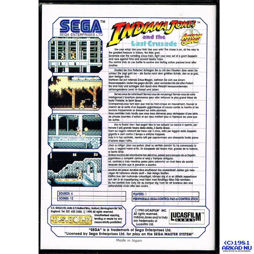 Indiana Jones and the Last Crusade: The Action Game släpptes 1989 av Lucasfilm Games, och är baserat på långfilmen med samma namn. Spelet släpptes till konsoler som ZX Spectrum, Amstrad CPC, Commodore 64, Atari ST, Commodore Amiga, DOS, Sega Master System, Sega Mega Drive och Sega Game Gear.