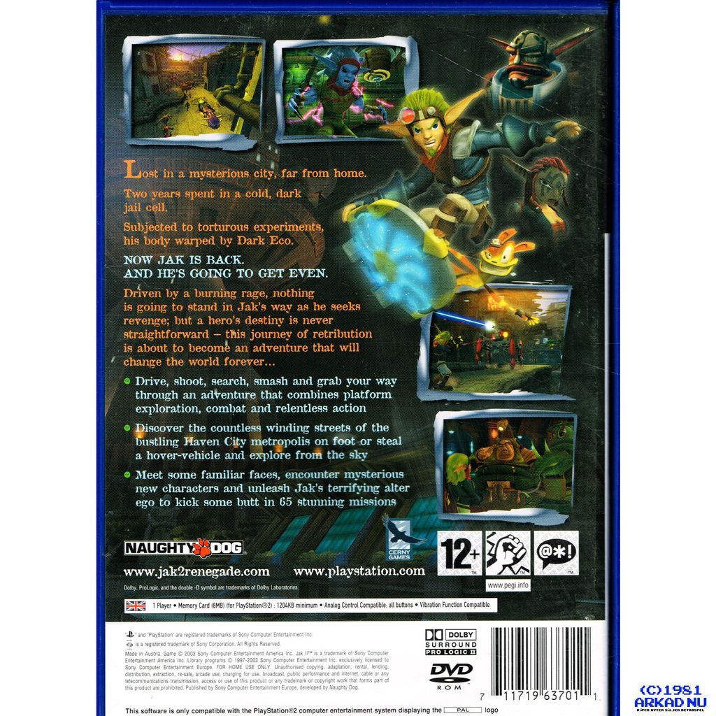 ⚡ Efter händelserna i det första spelet kastas Jak in i en dystopisk framtidsstad där han fängslas och experimenteras på. När han släpps fri är han ute efter hämnd – beväpnad med Dark Eco-krafter, vapen och ett nytt, hårdare attityd. Jak II: Renegade är en öppen värld fylld av uppdrag, fordon, action och en gripande story.